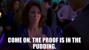 The proof is in the pudding, while lauding to yeast being a raising agent. It’s a good reference to mean someone doing what they said they intended. Someone says they will do something; we take it as good; they will follow through and you only know once the deed is done. And the more they dilly-dally and piss-arse around and it isn’t done? The so-called pudding is not done. So, to speak.
