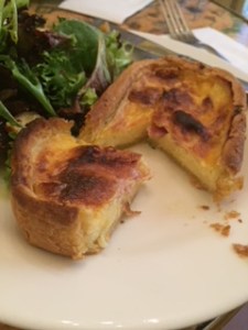 Today I’ve got a full crazy day of chiropractor, then acupuncture, then physio and I guess today’s offering? So, punchy/stabby and electric-shocky! Guess I should do it on a full tummy! Today’s offering, Pancetta Quiche, my medicine and a complimentary Macaron.