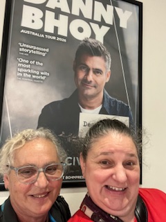 I mean, I don’t love doing selfies, I don’t do filters, who gives a flying tutti fruiti if I wear make-up even. But here’s a recent effort at a comedy gig with one of my lovely assistants. I’m the one concentrating on trying to get us both in the frame. It did hurt and you can see how much I was concentrating on getting it done.