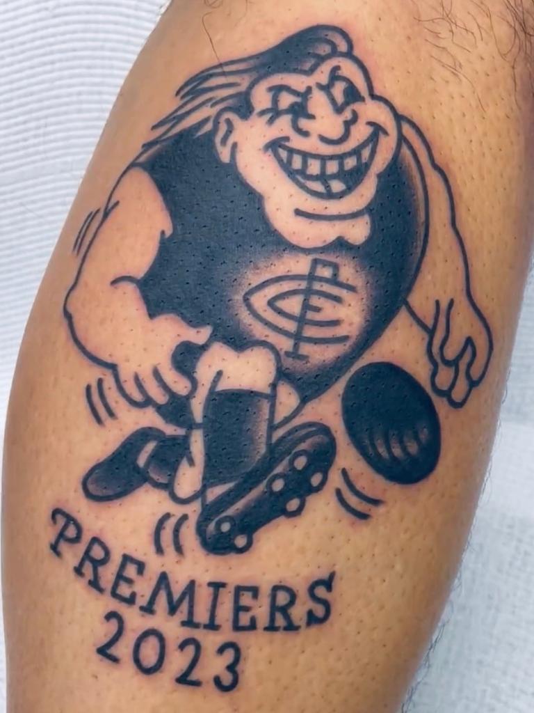 I suggested if our teams faced each other on grand final day and her team won I would get a tattoo of a Magpie on my butt! (it would be my first) and tiny. I suggested if the Blues, (yes, the Carlton mascot) won she had to get a Huge Blues tattoo across her upper chest on the left, it’s fine. She laughed. Stating “not a huge one?”