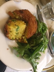 And lunch! Today’s offering is an Azaffarini Arancini with side salad. (Saffron rice/peas and mint) and medicine.